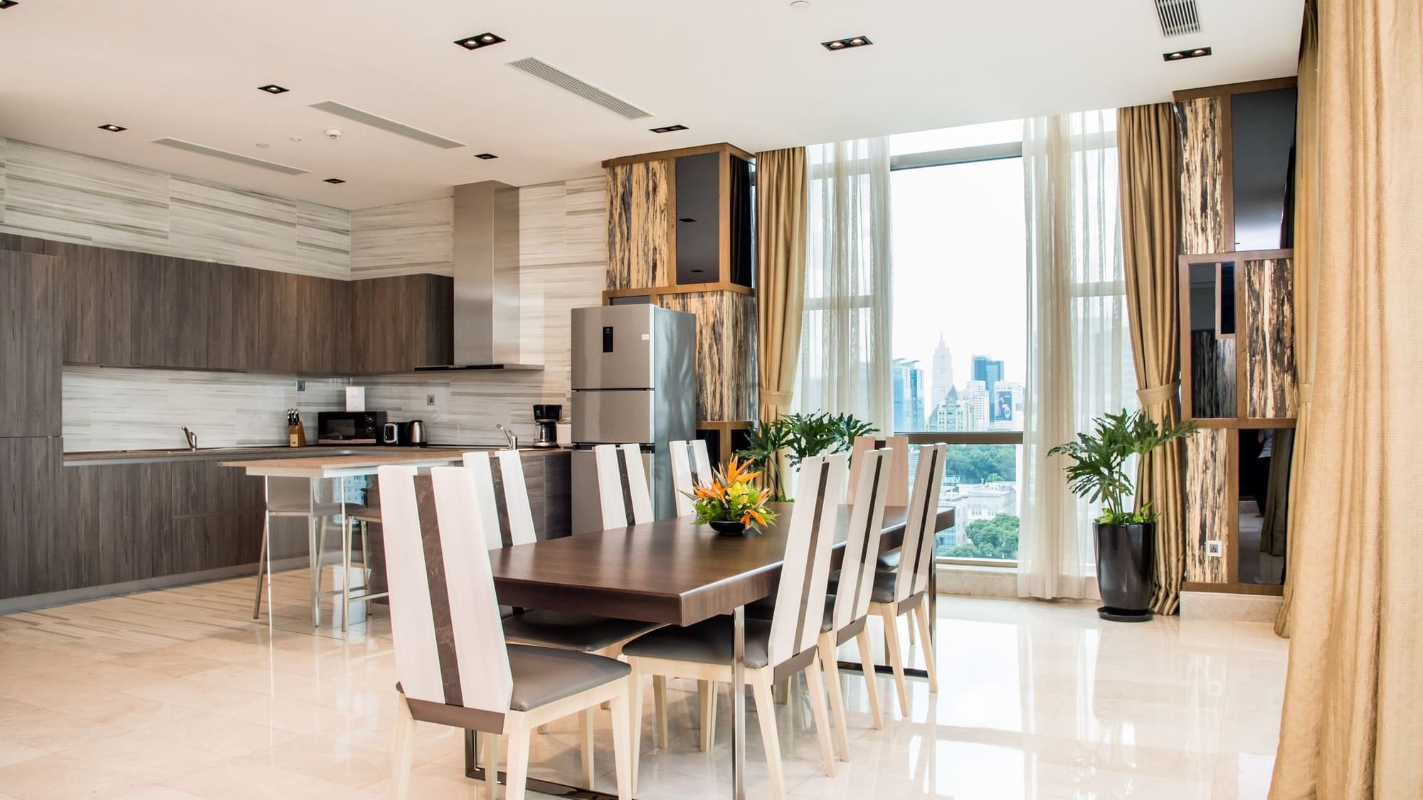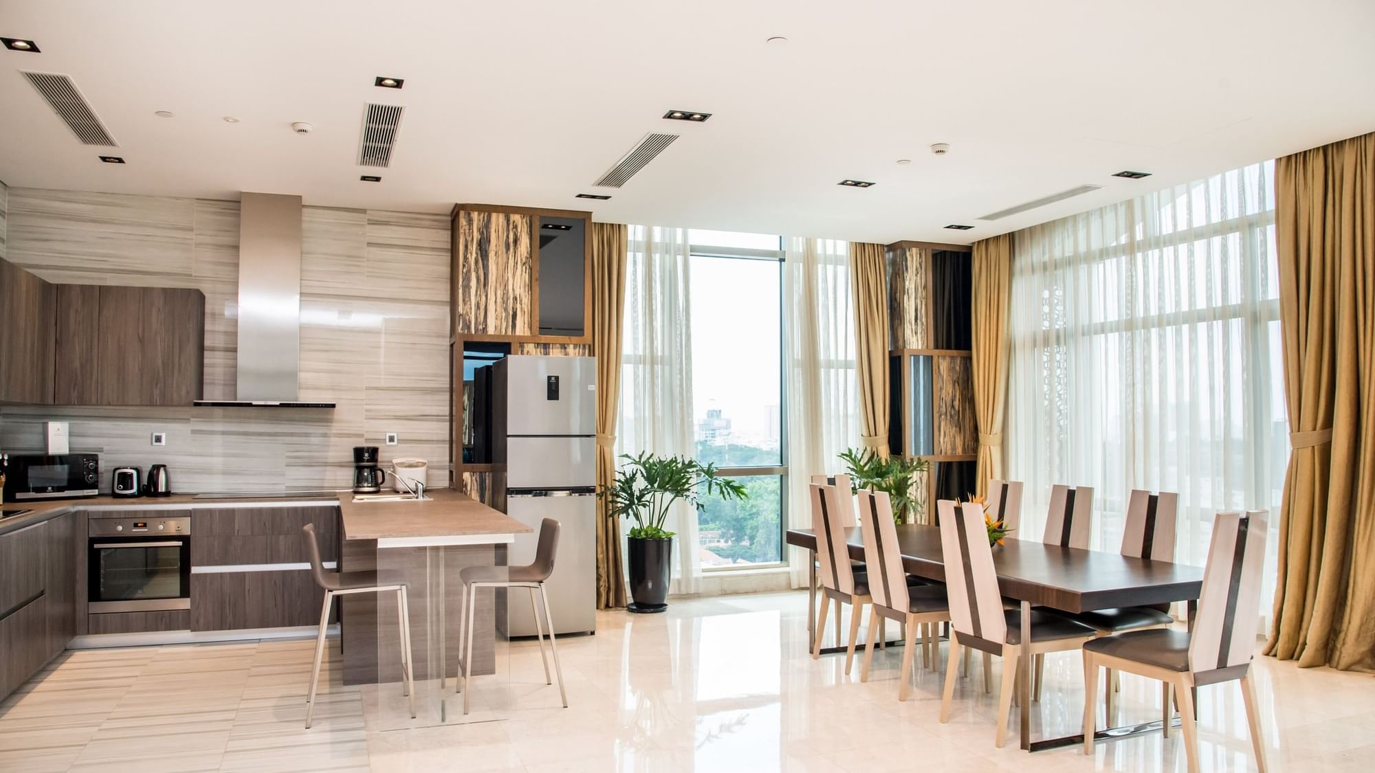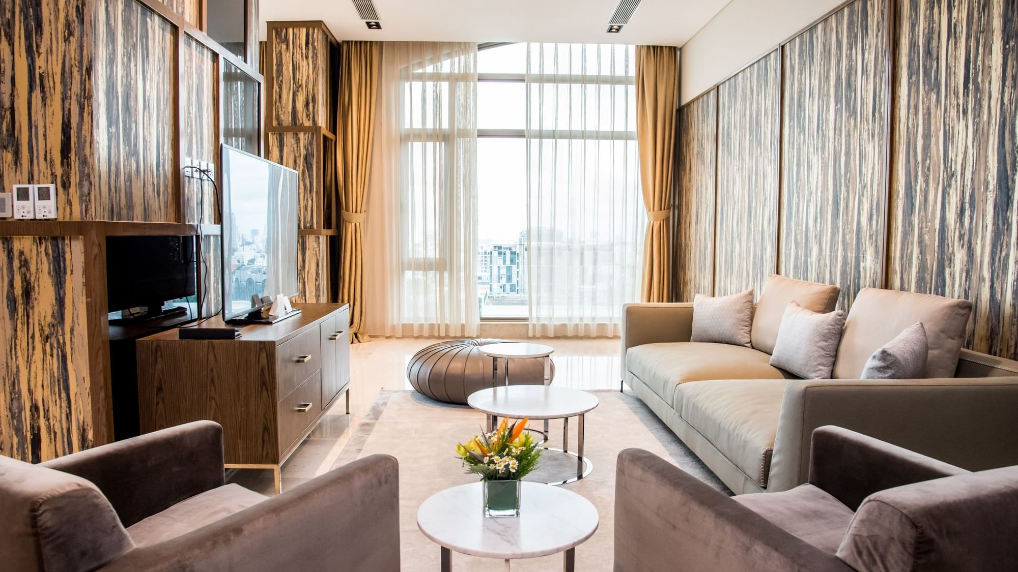 Căn hộ Deluxe Suite là căn hộ một phòng ngủ với diện tích hơn 61 mét vuông, phòng khách được thiết kế hiện đại có sofa, khu vực bếp đầy đủ tiện nghi kết hợp với không gian dùng bữa sang trọng, mang đến trải nghiệm phong cách sống đẳng cấp. Căn hộ Deluxe Suite là sự lựa chọn hoàn hảo cho những chuyến công tác hay nghỉ dưỡng cho bạn và gia đình
